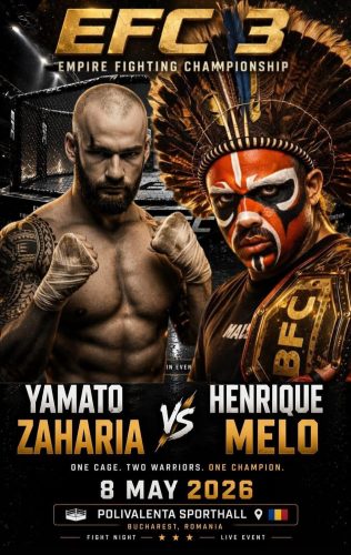 Afișul oficial al galei EFC 3, unde Yamato Zaharia îl va înfrunta pe Henrique Melo pe 8 mai 2026, la Sala Polivalentă din București.